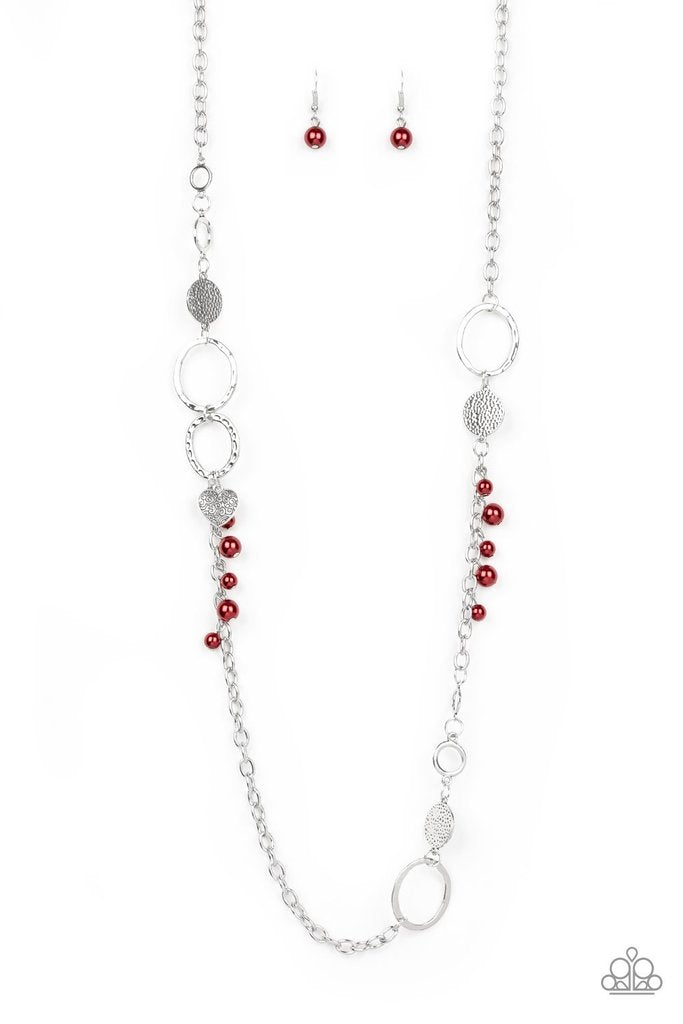Infused with sections of shimmery silver chains, an assortment of hammered silver discs and silver rings link across the chest. A collection of pearly red beads and dainty silver heart charms asymmetrically dots the glistening piece for a flirty finish. Features an adjustable clasp closure.
