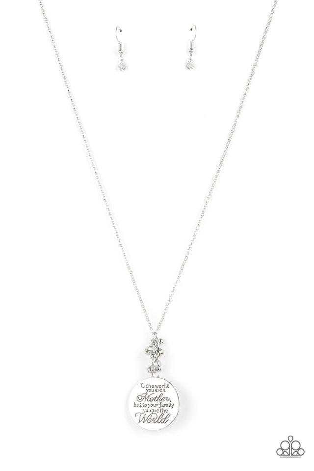 A silver disc inscribed with the phrase, "To the world you are a Mother, but to your family you are the World," creates a sweet reminder as it falls from a lengthened silver chain. A sprinkle of dainty white opals and silver beads adds a decorative fringe atop the memento. Features an adjustable clasp closure. Sold as one individual necklace. Includes one pair of matching earrings.
