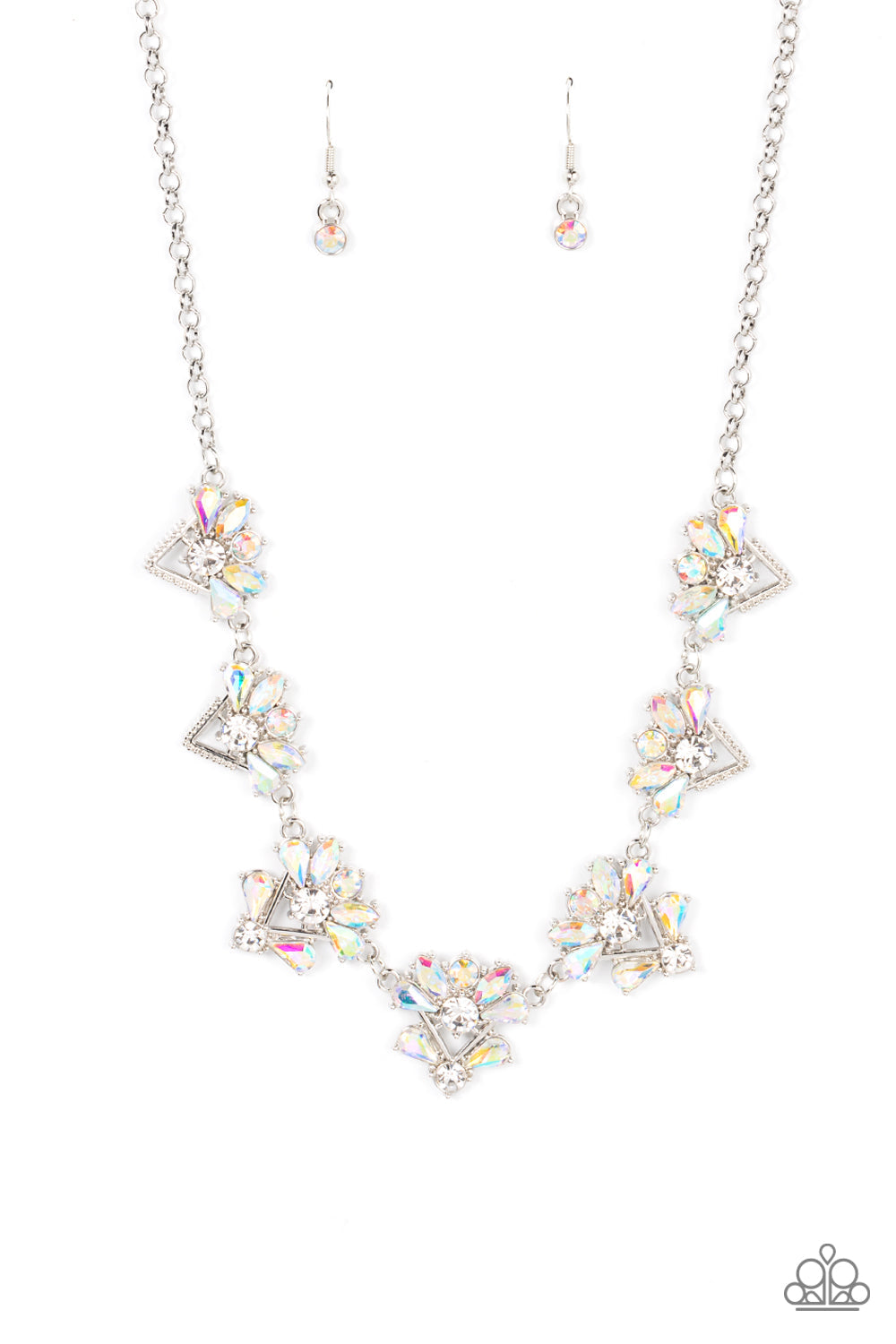 Featuring a stellar radiance, clusters of teardrop and marquise cut iridescent rhinestones fan out from white rhinestone centers along the tops of studded and pronged triangular frames. The centermost frames feature embellished bottoms, adding an extra splash of cosmic iridescence as the celestial frames link into an out-of-this-world sparkle below the collar. Features an adjustable clasp closure.