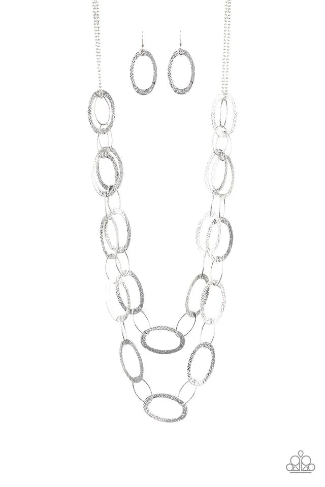 Delicately hammered in shimmery textures, two rows of glistening silver hoops layer down the chest for a sleek look. Features an adjustable clasp closure.