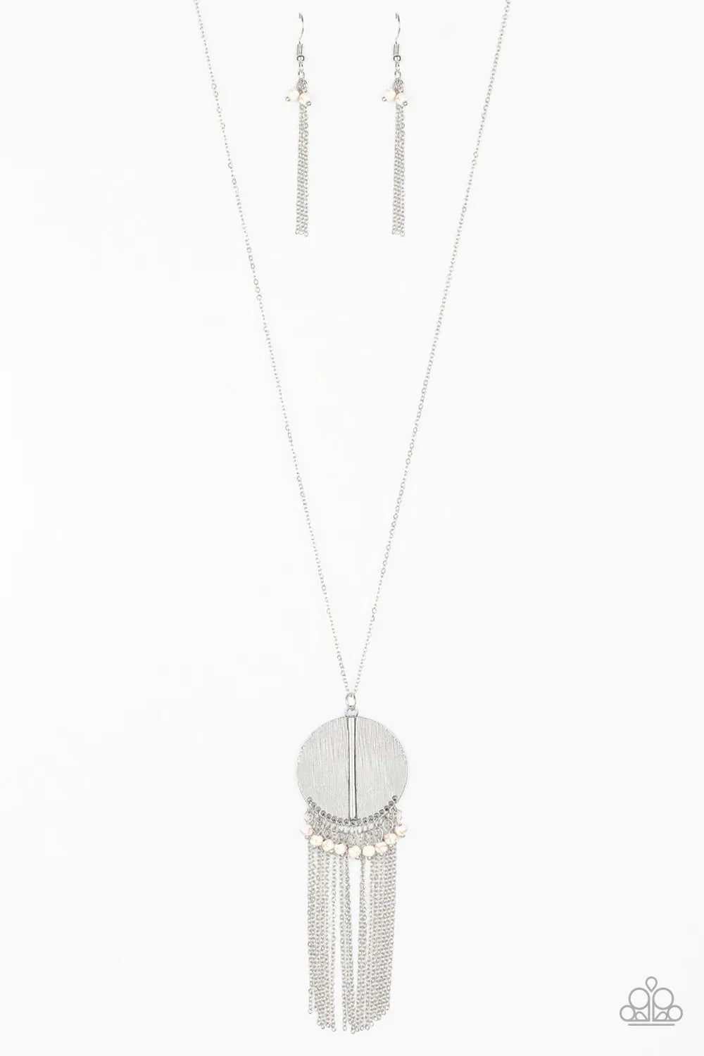 Brushed in a high-sheen finish, a scratched silver disc swings from the bottom of a lengthened silver chain. Dainty white stone beads and shimmery silver chains stream from the bottom of the artisan inspired pendant, creating a whimsical fringe. Feature an adjustable clasp closure. Sold as one individual necklace. Includes one pair of matching earrings.