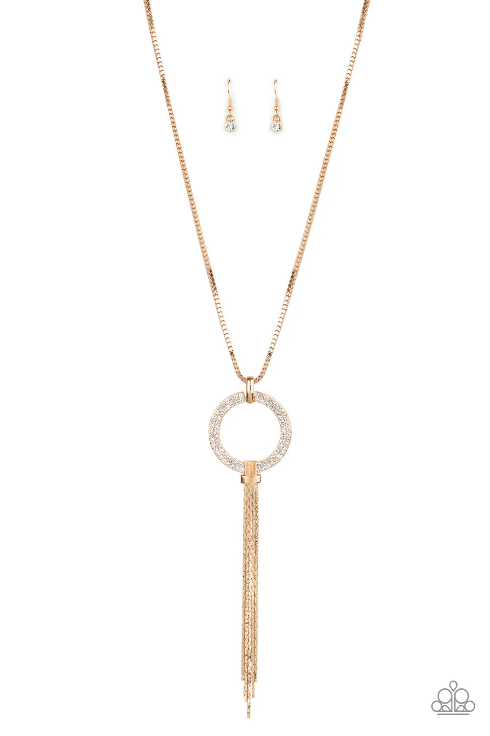 Encrusted in blinding white rhinestones, a sparkling gold ring swings from the bottom of a lengthened gold box chain. Flattened gold chains stream from the bottom of the glittery pendant for a regal finish. Features an adjustable clasp closure. Sold as one individual necklace. Includes one pair of matching earrings.