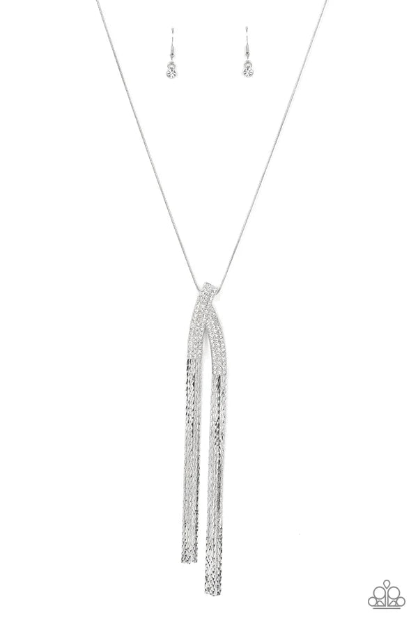 Flat silver chains stream out from the bottom of two overlapping white rhinestone encrusted frames, creating a timelessly twinkling pendant at the bottom of a lengthened silver snake chain. Features an adjustable clasp closure. Sold as one individual necklace. Includes one pair of matching silver earrings.