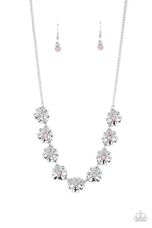 Heart-shaped silver petals bloom from opaque Gossamer Pink rhinestone centers, creating colorful flowers. The dainty floral frames delicately dance below the collar, connecting into a whimsical centerpiece. Features an adjustable clasp closure.