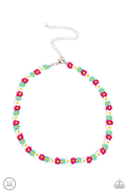 Threaded along an invisible wire along the collar, a lavish collection of seed bead petals in shades of Pink Peacock, tiffany blue, and white bloom around yellow seed bead centers for a fanciful floral collection. Features an adjustable clasp closure.