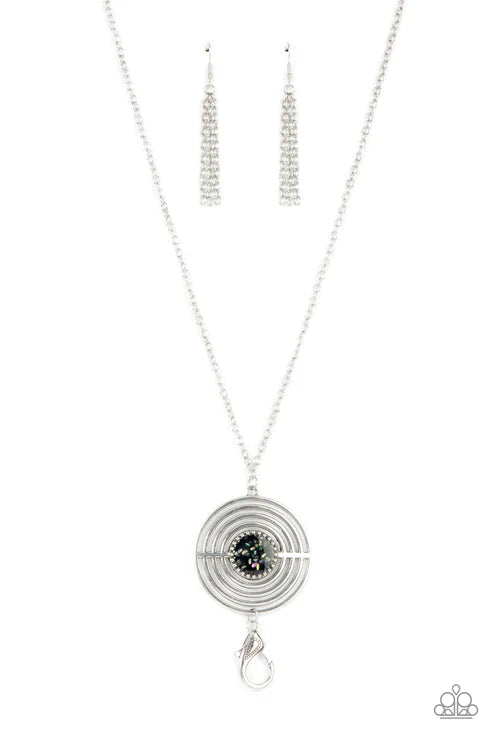 Flecked in iridescent shell-like accents, a studded black frame adorns the center of an oversized silver pendant rippling with concentric circles at the bottom of an extended silver chain for a dizzying pop of color. A lobster clasp hangs from the bottom of the design to allow a name badge or other item to be attached. Features an adjustable clasp closure.
