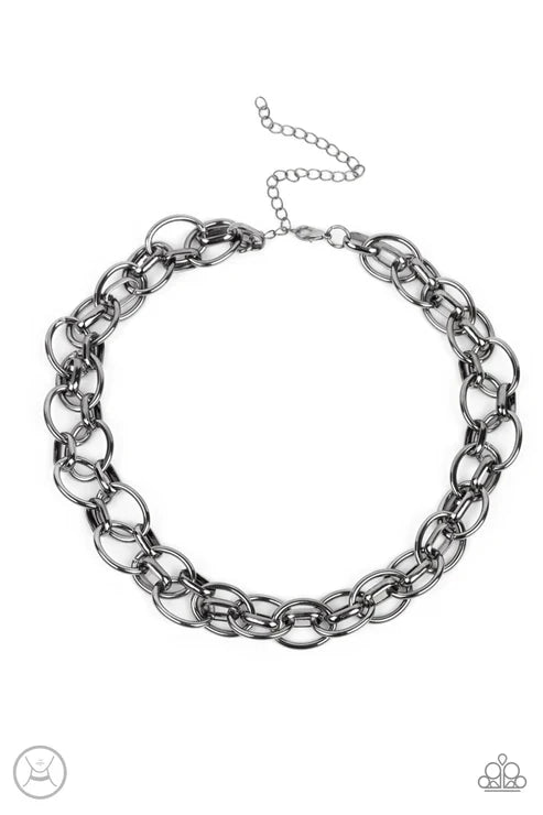 an oval linked chain, resulting in a rebellious fashion around the neck. Features an adjustable clasp closure.