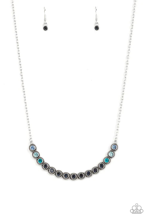 Encased in studded silver fittings, a glittery ombré of blue rhinestones delicately bows below the collar, creating an enchanting pop of color. Features an adjustable clasp closure. Sold as one individual necklace. Includes one pair of matching earrings.