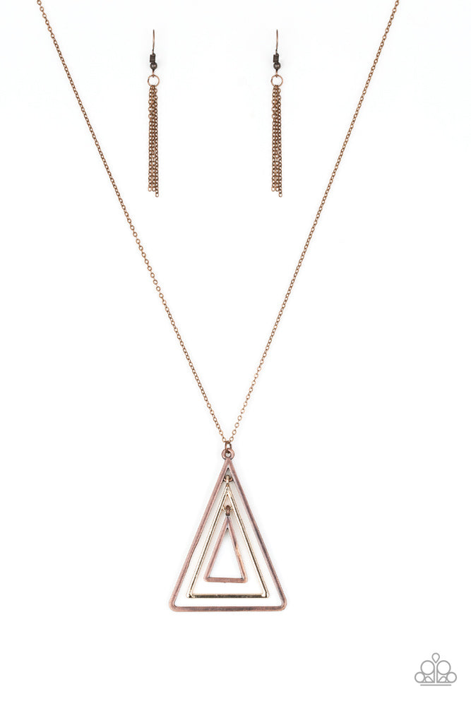 Infused with an elongated copper chain, glistening gold and copper triangular frames layer into a gorgeously stacked pendant for an edgy look. Features an adjustable clasp closure.