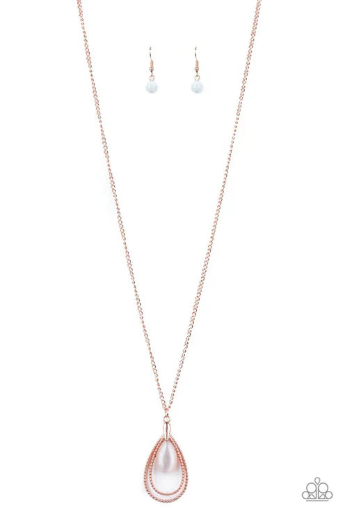 Studded shiny copper teardrops swing from the bottom of a shiny copper chain. A glowing cat's eye stone attaches to the innermost frame, creating a whimsical pendant. Features an adjustable clasp closure. Sold as one individual necklace. Includes one pair of matching earrings.