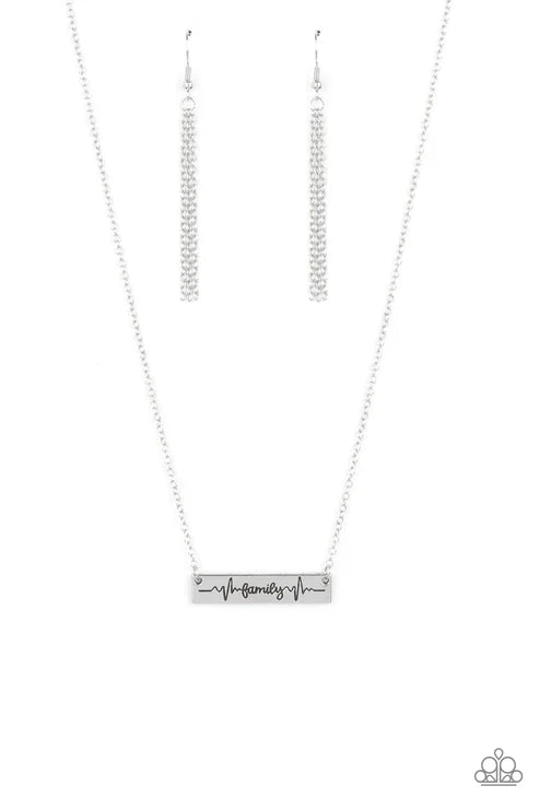 The word "Family," is inscribed between symbolic life lines on a rectangular silver plate creating an affectionate keepsake on a dainty silver chain below the collar. Features an adjustable clasp closure.