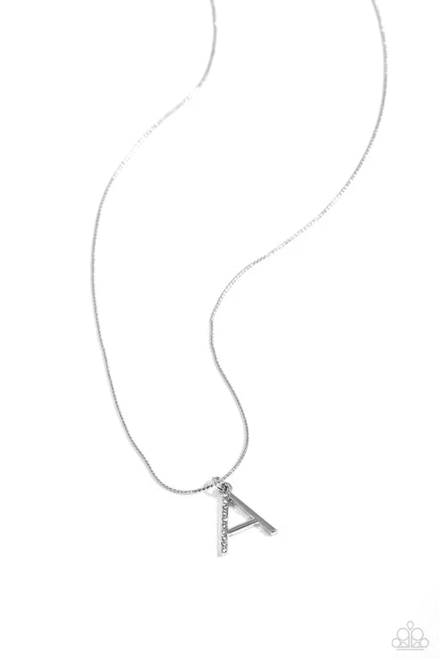 A row of glistening white rhinestones encrusts along one side of a silver letter "A," hovering below the collar from a dainty silver chain for a sentimentally simple design. Features an adjustable clasp closure.