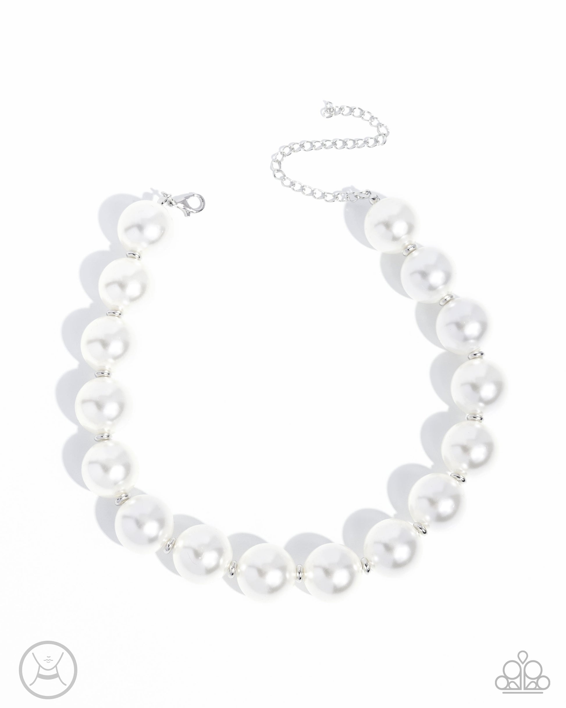 A strand of oversized glossy white pearls is accented with dainty silver beads, creating a classic and sophisticated design. Features an adjustable clasp closure.