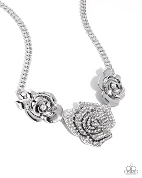 Connecting to a high-sheen silver curb chain, white rhinestone-centered three-dimensional blooming silver roses frame a white rhinestone-dusted flattened three-dimensional flower for a whimsically adorable arrangement below the neckline. Features an adjustable clasp closure. Sold as one individual necklace. Includes one pair of matching earrings.