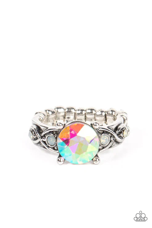 An oversized iridescent gem is nestled between silver prongs atop a band swirling with silver ribbons and dotted with dainty opal rhinestones, resulting in a stellar sparkle atop the finger. Features a dainty stretchy band for a flexible fit.