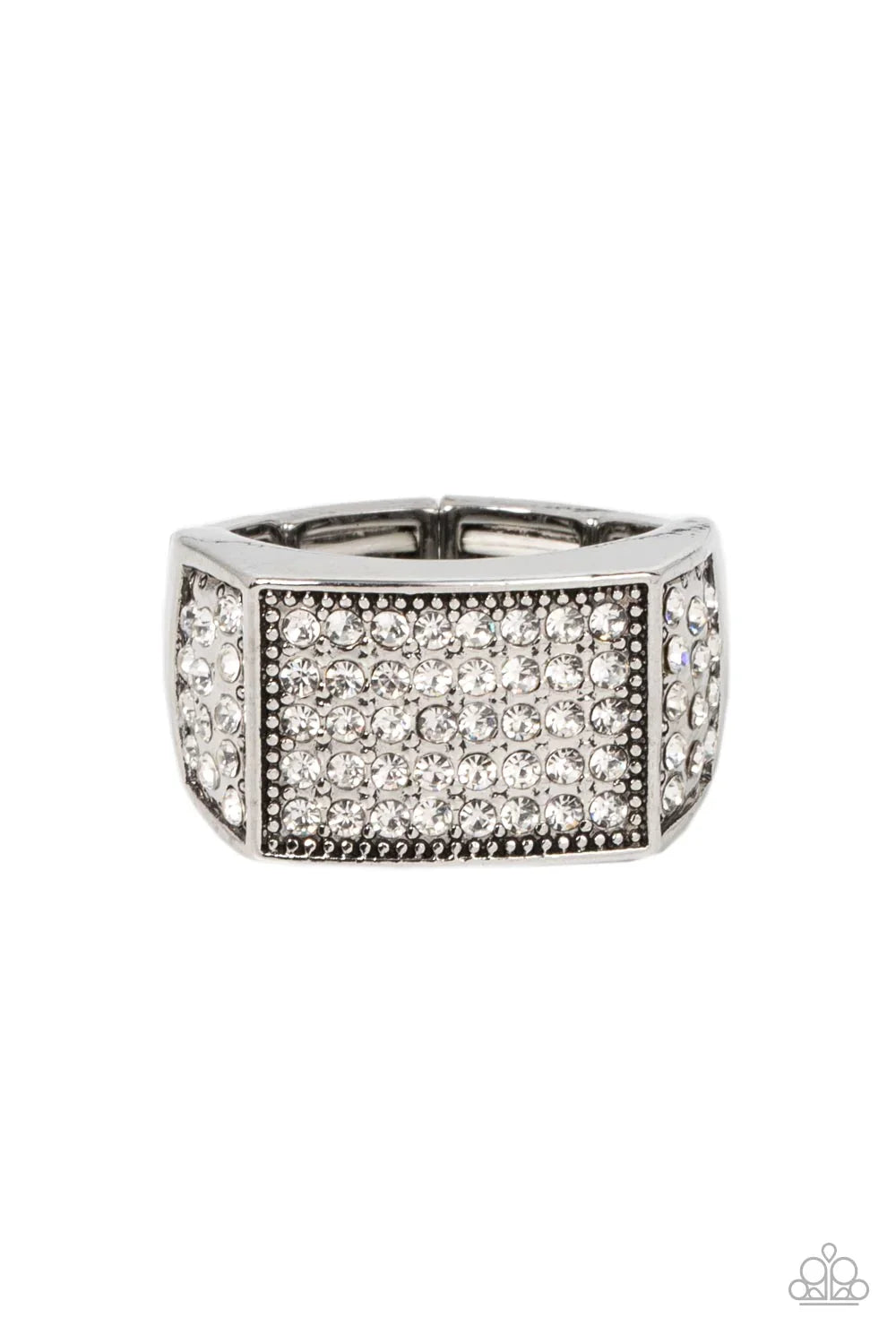 The front of a rectangular silver frame is encrusted in sections of white rhinestones, resulting in a smoldering centerpiece atop the finger. Features a stretchy band for a flexible fit.
