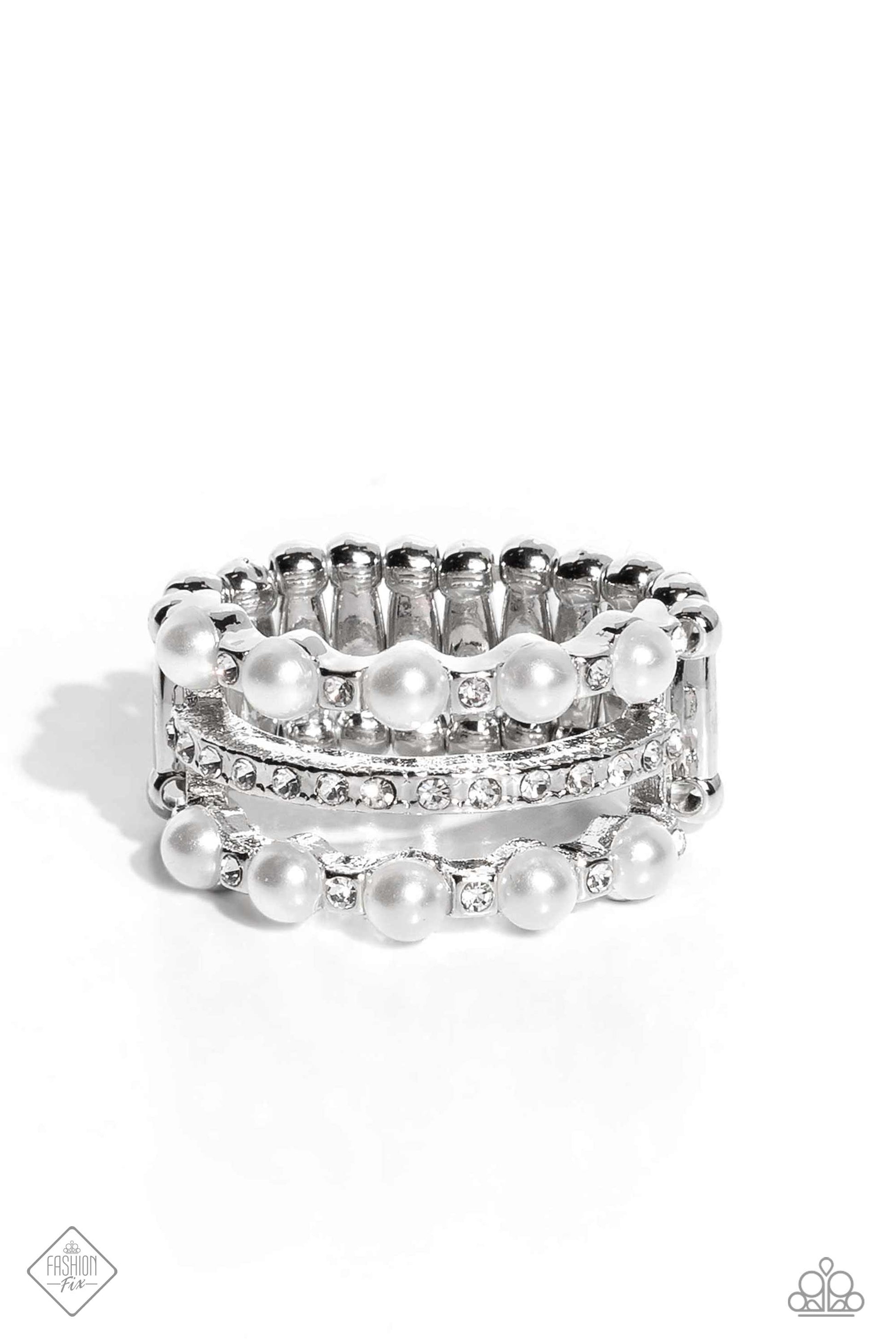 Dainty, bubbly white pearls and glittery white rhinestones are sprinkled across three airy silver bands, creating a refined centerpiece. The centermost band features rhinestones only, drawing the eye to its subtle sparkle. Features a stretchy band for a flexible fit.