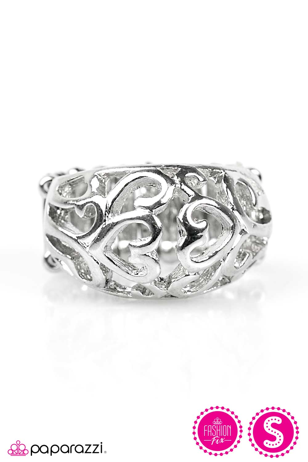Silver filigree swirls across the finger creating an airy band of hearts. The skin peeks beneath the airy pattern, adding a whimsical flair to the enchanting display.