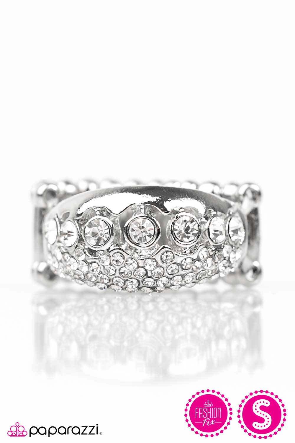 Countless sparkling white rhinestones are sprinkled across a glistening silver band. A silver bar bows just below the incandescent sparkle, revealing a row of larger white rhinestones for a timeless finish.