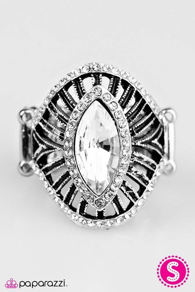 Featuring a regal marquise-cut, a white gem crowns the center of an ornate silver frame for a refined finish. Dainty white rhinestones are sprinkled along the delicately textured frame, adding an industrial flair to the commanding piece.