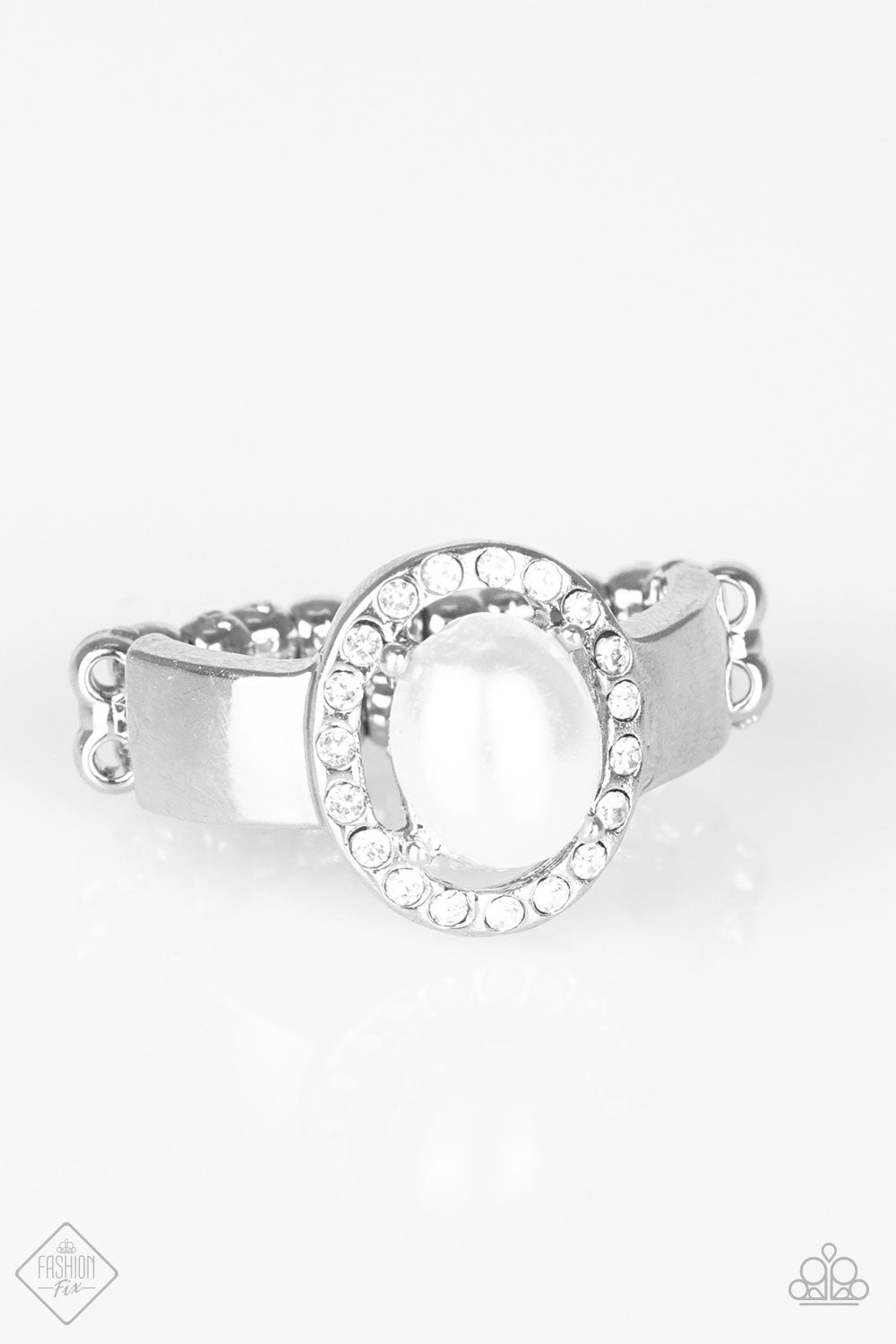 A pearly white bead is pressed into a white rhinestone encrusted frame, creating the illusion of a floating centerpiece atop the finger. Features a dainty stretchy band for a flexible fit.
