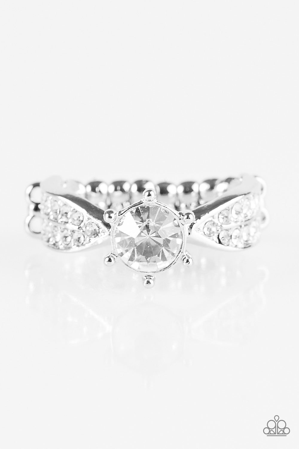Encrusted in dazzling white rhinestones, glistening silver bands attach to a glittery white rhinestone centerpiece, for a regal finish. Features a dainty stretchy band for a flexible fit.