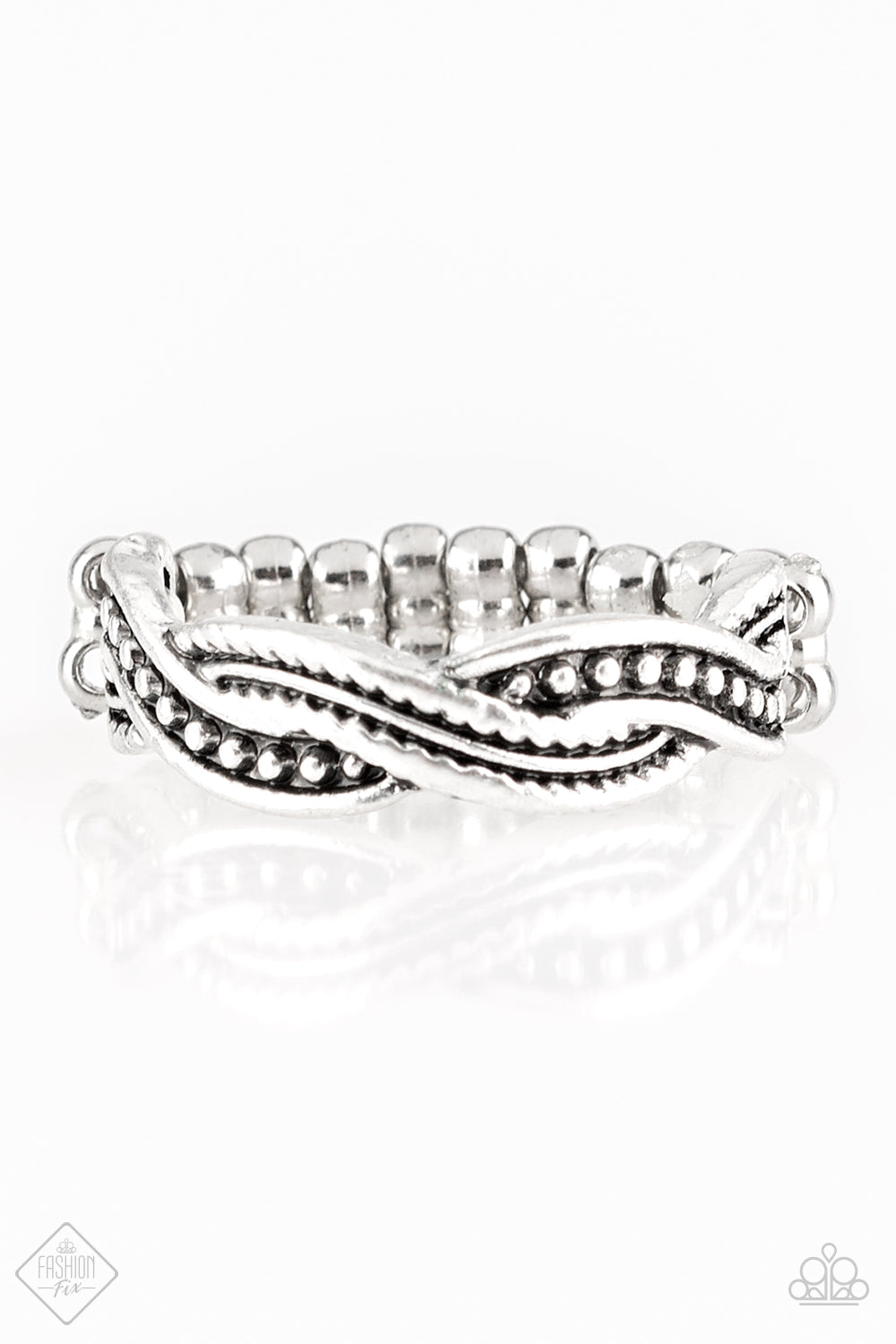 Featuring mismatched textures, ribbons of antiqued silver bands braid across the finger for a tribal inspired look. Features a dainty stretchy band.