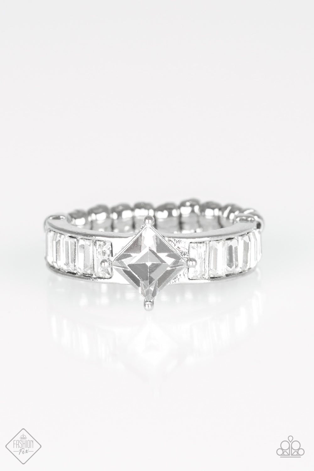 Featuring elegant emerald style cuts, glassy white rhinestones are pressed into a sleek silver band. A radiant white square rhinestone is pressed into the center of the glittery band, creating a glamorous centerpiece atop the finger. Features a dainty stretchy band for a flexible fit.