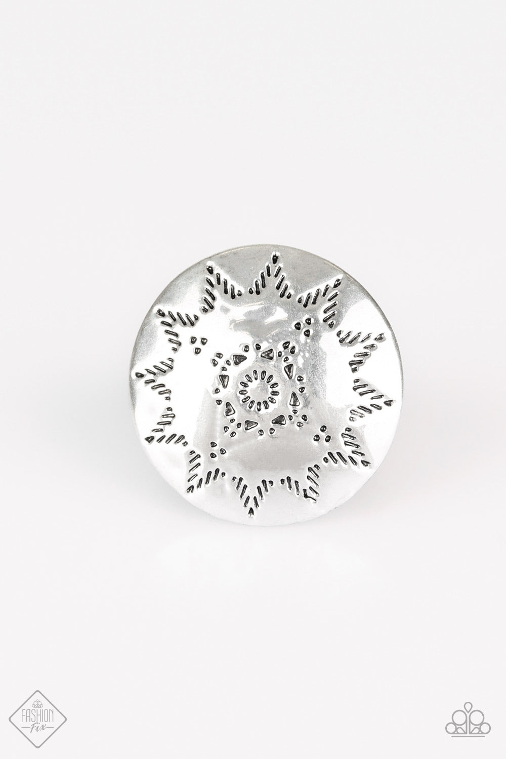 A shiny silver disc dotted in a radiant sunburst pattern fans out atop the finger for a seasonal look. Features a stretchy band for a flexible fit.