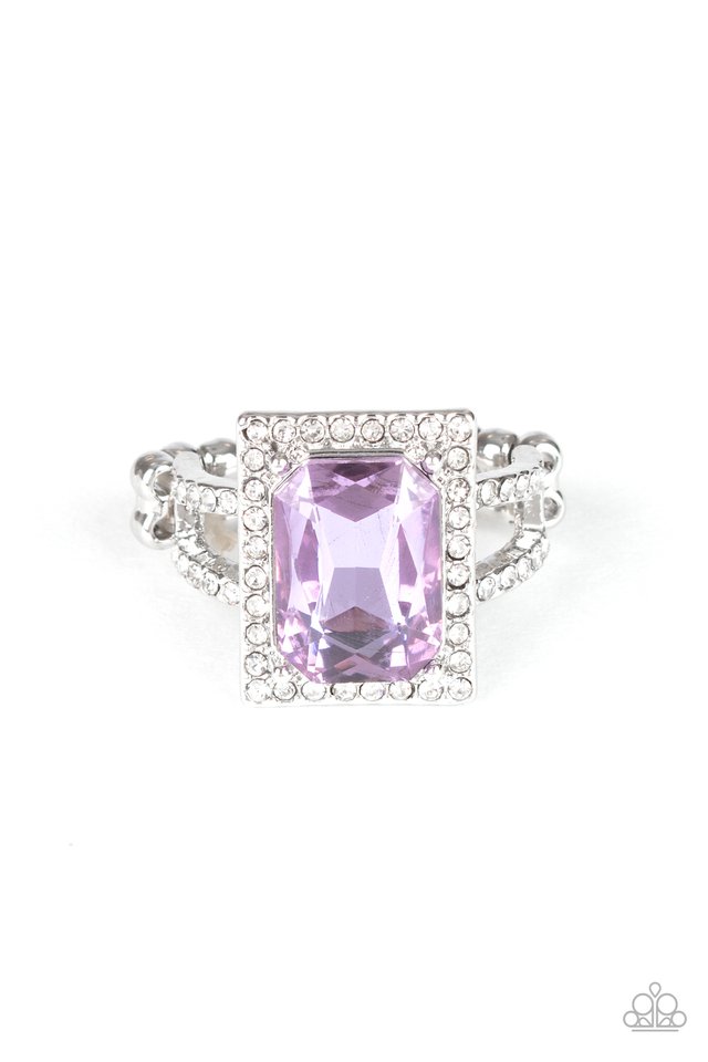 Featuring a regal emerald cut, a glittery purple rhinestone, sits atop a rectangular silver frame encrusted in dazzling white rhinestones for a statement-making finish. Features a dainty stretchy band for a flexible fit.