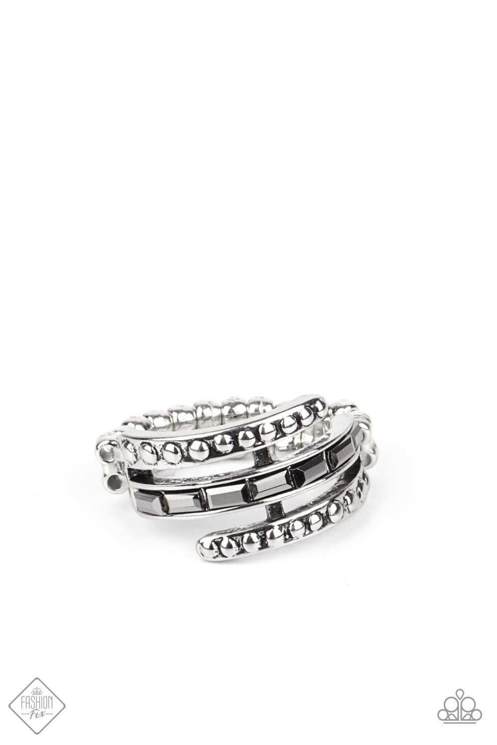 Two studded silver bars flank a dainty row of emerald cut hematite rhinestones, creating the illusion of a stack of wraparound bands that make a lasting impression. Features a dainty stretchy band for flexible fit.